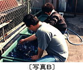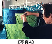 (写真A後方)に変わっていきます。二度染めして、いよいよ糊を洗います(写真B)。