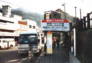 【写真は会場への無料バス待合所;箱根湯本駅前】