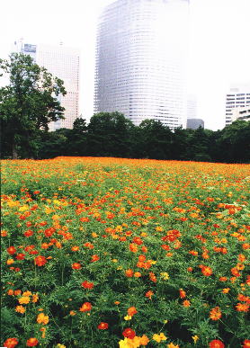 同庭園の約3000uのお花畑には、オレンジ色のキバナコスモス13万本と桃色・白・紫の日本的なメキシコ原産コスモス18万本が開花、蝶やトンボ・蜂が飛び交い、汐留地区の高層ビル群を背に都心とは思えない空間が形成されています。