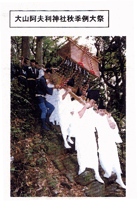 (1)27日(水)大山中腹の阿夫利神社下社からご神体を納めた神輿を大山麓の社務局まで担いで下ろす「お丁り」(6時30分頃下社発、9時頃大山ケーブル追分駅付近発、大山の町内を神幸渡御12時頃社務局着)