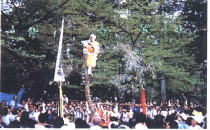 13時神社出発→市内を練り歩き→17時頃神社に戻った後→境内でチマキがまかれる。14時頃より境内の神楽殿でお神楽が奉納され、神社裏に植木市がたつ。