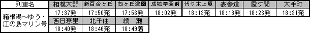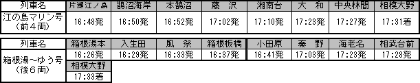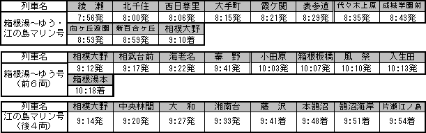 都心方面から箱根地区や江の島地区へのレジャーなどに便利な直通列車、「箱根湯〜ゆう・江の島マリン号」が、7月24日(土)から8月22日(日)までの毎土・日曜日に運転される。 「箱根湯〜ゆう・江の島マリン号」は東京メトロ千代田線綾瀬駅から小田急小田原線を経由し、相模大野駅で分割後、箱根登山鉄道箱根湯本駅及び小田急江ノ島線片瀬江ノ島駅までを乗り換えなしで結ぶ、夏の行楽列車。昨年,、営団地下鉄千代田線と小田急線との相互直通運転25周年を記念して夏期の土曜日に綾瀬→箱根湯本/片瀬江ノ島間に運転されたのがはじまり。今年から、上り列車(綾瀬行き)も運転されることになった。 , 停車駅と発車時刻 ○往 路 ![]() ※相模大野駅で「箱根湯〜ゆう号(前6両)」と「江の島マリン号(後4両)」に分割して運転いたします。 ○復 路 ![]() ※相模大野駅で箱根湯本発の「箱根湯〜ゆう号(6両編成)」と片瀬江ノ島発の「江の島マリン号(4両編成)」を連結し、運転いたします。