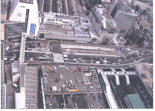 ![]() サザンテラスができて新しい人の流れができたといわれる新宿南口で、国土交通省が進める道路事業を核とした都市再生プラン「新縮南口地区基盤整備事業」が進んでいる。 新宿駅は1日の乗降客数全国1位の約320万人、そのうち約43万人が南口を利用し、駅前の甲州街道は歩行者がスムーズに行き交うこともできない。 また、毎日約6万台の車が走る新宿跨線橋は片側3車線のうち1車線以上が客待ちのタクシーや路上駐車の車であふれ、渋滞している。 新宿駅周辺には高速バス関連施設が多いが分散してわかりにくく、他の交通機関への乗り換えも不便で、雨の日は特に最悪だ。 なかでも、交通の要所となっている新宿跨線橋は関東大震災の大正14年に架橋された老橋である。 こうした現状を改良するために計画された整備事業は @新宿跨線橋の架け替え A交通広場やゆとり空間の創出 B新宿駅周辺の回遊性 の確保の3つのプロジェクトからなる。 現在はJR線上を渡る甲州街道「新宿跨線橋」の80年ぶりの架替工事が進捗中で鉄製の工事用基盤が出現している。 この基盤は将来、バスやタクシー用の交通広場の一部として残ることになるが、今の姿は広場完成時の4分の1程度でしかない。 架け替えとなるのは、サザンテラスと小田急ミロードを結ぶペデストリアンデッキから駅街路10号(タカシマヤ脇の道路)を見下ろす部分まで。 新しい橋梁は、幅員50m(現在幅員30m)、橋長127m(現在橋長123メートル)になり、歩道も現在の幅5mから8mに広がり、ゆとりある空間となって歩きやすくなる。 その他の区間でも耐震工事などを徹底し、構造的にも優れたものになる。 JR東日本の線路上空に約1・3へクタールの人工基盤を創り出し、2階/駅施設・歩行者広場、3階/タクシー一般車乗降場等、4階/高速バス関連施設というように、多層構造の建物を建てて、鉄道・バス・自動車・タタシーが連携する総合的な交通拠点として生まれ変わる。あわせてJR東日本では駅ビルを建築する構想もある。 跨線橋(拡幅・袈替え)の完成は平成19年度中、人工地盤(交通広場など)の整備完了は平成20年代前半になる見込み。