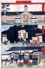 王政復古の大号令の下、明治新政府は新たな国家建設に併せ、江戸を東京に改め、それまであった幕府の役所に替わり、新しいさまざまな役所を設けました。 役所の施設ははじめ、大名屋敷などの既存の建物を流用、一部活用したりもしましたが、やがてジョサイヤ・コンドルなどの外国人の設計によるものや、海外からの影響を色濃く反映した日本人の手によるものなど、洋風建物を建て、役所の施設としました。 これらの建物は明治東京の新名所となり、さまざまな錦絵に新しい役所の名称とともに描かれ、 人々に紹介されました。 今回は明治新政府の舵取りを担った人々が働き、明治東京の新名所となった、 「国会」 「裁判所」 「博物館」など、さまざまな政府の役所や施設をf苗いた作品、約30点を展示紹介します。 〜明治東京の新名所〜「新しい役所 新しい建物』展 ■会 期=2005年4月1日 (金)〜6月29日 (水) ※5月2日(月)は開館 ■時 間=午前10時〜午後5時(入館は午後4時まで) ■会 場=くGAS MUSEUM がす資料館>ガス灯館2階「錦絵ギャラリー」 (東京都小平市大沼町2−590) ■入 館=無料 ■展示内容=「国会」 「裁判所」 「博物館」など、明治新政府の役所施設を描いた作品、 約30点を展示紹介 ■問合せ=TEL:042−342−1715/FAX:042−342−8057 (月曜日を除く午前10時〜午後5時)
