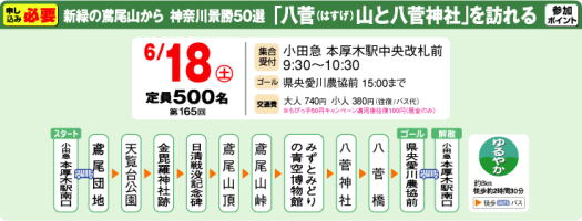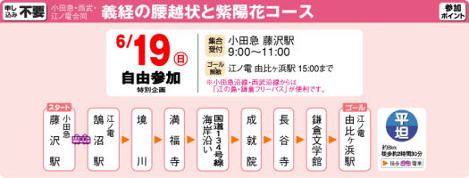 ![]() ![]() ![]() ![]() 【 参加要領 】 ■参加費=各コースとも無料(交通費、昼食、施設入場料などは参加者負担) ■参加注意=@昼食、雨具は各自持参。 Aケガ、事故等についての責任は主催者では負いかねます。 B自家用車での参加は不可。 ■申込み方法=往復ハガキに参加希望コース名と申込人数(何名でも可)、代表者の郵便番号、住所、氏名、年齢、電話番号、自宅の最寄り駅を明記のうえ、各開催日の7日前(必着)までに下記宛へ。先着順に参加カード(返信ハガキ)を送付。 ■参加ポイント=各1回参加で1ポイント。 10ポイントで漏れなく「達成賞」、抽選で20名にアウトドアシューズプレゼント。 ■宛先・詳細問合せ=〒160 -8309 新宿区西新宿1-8-3小田急電鉄梶@営業推進部 「のんびりハイク&ウォーク」係 TEL.03・3349・2166(平日9:30〜17:45)