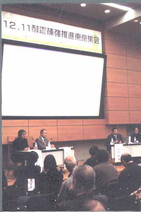 また、「耐震補強フォーラム」実行委員会によると東京に大規模な直下型地震が起ったとき、最悪、建物20万棟が全壊、約65万棟が火災で全焼し700万人が避難所暮らしになるという。「このような大惨状を防ぐためには、建物の耐震補強しかない。しかし、国や自治体、建築関係者の努力にもかかわらず耐震補強はほとんど進んでいない。市民ひとりひとりが自分の命や家は自分で守るしかないという認識を高めよう」。 このような趣旨で耐震補強の啓蒙・PR活動を行っている特定非営利活動法人「東京いのちのポータルサイト」が、この12月11日、「耐震補強推進東京集会」を田町・建築会館ホールで開いた。 集会に駆けつけ挨拶に立った沓掛防災担当大臣は、「中央防災会議で耐震改修費の補助することが決まった」「小泉首相も防災は国に適した業務だと話している」など、国の耐震補強政策への取り組みを語る。耐震強度偽装事件が社会問題になっている時節柄、集まった約300人の参加者は熱心に耳を傾けていた。 集会の主テーマ「耐震補強の最前線」と題する討論会では中野区(田中・同区長)、平塚市(福井・同市耐震補強推進協議会副会長)、三鷹市(淡河・住まいのあんしんネット代表)、早稲田商店会(藤村・同事業部長)、板橋区(鍵屋・同区福祉事務所長)などにより各々の地域の耐震補強への取り組み状況が発表された。 パネリストとして登場したNPO法人日本耐震防災事業団の小口悦央理事長(写真上、右から2番目)は「既存の木造建物に推定1000万棟の構造不適確建物が存在する」とのデータを提示し、参加者の活動への取り組みを援護。横浜市立大学西村助教授は、阪神・淡路大震災で監察医として、不幸にして亡くなった人々一人ひとりへの沈痛な体験から、その原因が「建物や家具」 にあることを突き止め、「法医学者としてその死は無駄にしない」との意志を述べ、自分の命や家を守るには家の耐震補強に尽きると総括した。 ![]() 同集会の耐震補強の出展者は16団体。 そのなかプレゼンテーションを行なったのは4団体。そのトップをきって「日本耐震防災事業団」が耐震補強装置「DSG」について説明。外付け工法であり施工は数日程度、免震ゴムが挿入でき直下型地震も緩衝できるなどの特長を紹介。(写真中) 「東京いのちのポータルサイト」構想としては、利用者が使い慣れたシステムを構築すること、地域・民間主導で推進すること、ITの全面活用の、3つのポイントを掲げている。同サイト安井理事長の挨拶で集会は幕を閉じた
