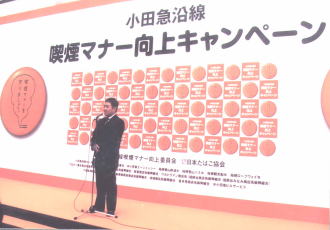 ![]() 駅周辺などで、たばこの吸殻のポイ捨てなど喫煙マナーが守られていない現状、下北沢一番街商店街の副理事長で洋菓子店「つくしや」の久保田英文さんが、2月8日、PRイベント「小田急沿線喫煙マナー向上キャンペーン」に一役かった。 同キャンペーンは「(社)日本たばこ協会」が設立した「小田急沿線喫煙マナー向上委員会」の主催によるもの。 新宿ミロード「モザイク広場」で午後2時からスタートした同キャンペーンで、久保田さんは主催者を代表し「わがまちを愛する心が大切」と挨拶(写真上)。続いてキャンペーン隊の隊長にタレントの「さとう珠緒さん」を任命した。 隊長に任命されたさとう珠緒さんは、「マナーの悪いと思う人は?」との司会者の質問に、クリーンアップレディの前、「歩きながら吸いポイ捨てする人。そんな人には珠緒は怒ってプンプンプン、ベロベロベロベー」と“振り付き珠緒節”で応え、集まった約100人のファンなどにおどけてみせた。(写真下) 「日本たばこ協会」は日本たばこ産業(株)ほか17社の正・賛助会員で組織され、未成年者の喫煙問題、喫煙マナーの向上、ニコチン等測定事業などを行なう社団法人。 今回の「小田急沿線喫煙マナー向上キャンペーン」には小田急不動産、箱根登山鉄道など小田急グループ8社と下北沢、経堂、祖師谷、成城などの地区の9商店街組織が参画した。 同キャンペーンはこの日を皮切りに2006年3月(予定)まで実施、期間中小田急沿線の商店街などでクリーンアップ隊(学生)による清掃活動のほか、携帯灰皿サンプリング、喫煙スペース設置などを行い、喫煙マナーの向上を訴える。
