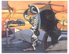 1940年8月、パリ陥落ののち最後の引揚げ船となった白山丸で、岡本太郎(1911-1996)は十年余にわたる滞仏生活に終止符を打って帰国した。そのわずか1年半後、今度は31歳ながら召集を受けて中国戦線に出征。ニ等兵として各地を転戦したのち収容所生活を経て復員したのは、終戦後1年近くが過ぎた1946年6月のことだった。 東京・青山の自宅はパリから持ち帰った滞欧作すべてとともに空襲で焼欠。まさに無一文からの再出発となったが、岡本太郎の戦後はここから始まった。 生活の建て直しとともに、岡本は極めて迅速かつ精力的に、この復興期、画家としての活動を再開してゆく。復員した年の暮れには世田谷・上野毛にアトリエを構え、仁科会会員となって新作を発表しはじめるとともに、挿絵や装禎の仕事も多数こなし、また1949年には前衛美術の牙城ともなる第1回読売アンデパンダン展に出品。画壇再編の趨勢のなかで特異な先鋭的理論家として指導的役割を担うようになる。 一方、1947年に出逢った花田清輝とともに「夜の会」を発会し、「世紀の会」のメンバーらもあわせて、文学者たちと、新たな芸術とその総合を標榜。日々、芸術・文化・社会をめぐって熱き議諭を闘わせ、そこで独自の「対極主義」を唱え、さまざまな芸術論の執筆に健筆を奮い、かつ、アトリエにあっては他に例を見ない実に個性的な絵画を次々と制作していった。 この稀有なる才能と尋常ならざるエネルギーを備えたひとりの画家が、戦後復興期という特異な時代の空気のなかで、人生の再出発を図ることになったという経緯こそ、何より興昧深い歴史的出来事といっていいだろう。 本展ではそうした経緯を、青山にアトリエを移すまでの世田谷時代(1946-1956)に焦点を絞って再検証する。絵画作品約20点をはじめ、この時期に制作された岡本の代表作とともに、同時代に活躍した二科展や読売アンデパンダン展関連の美術家、および「夜の会」や「世紀の会」に関わった文学者たちの作品や資料を多数展覧し、岡本の活動のみならずその背景となった時代の特質を省察する。