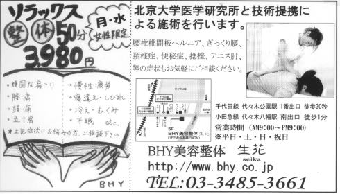リラックス整体 ・頑固な肩こり ・腰痛 ・頭痛 ・五十肩 ・慢性疲労 ・寝冷え・しびれ ・冷え・むくみ ・不眠 ・etc 上記症状にお悩みの方、ご相談ください。 『マイソフトニュース』を他のメディア(雑誌等)にご案内下さる節は、当社までご連絡願います。 Copyright(c)1999-2006 Mysoft co. ltd. All Rights Reserved.