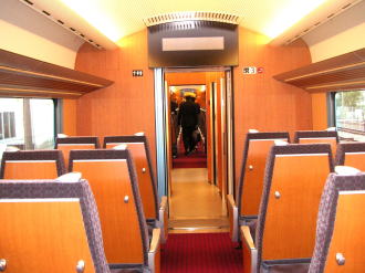 内装にも様々なこだわりがある。天井が高く、広々とした幅を持つ車内。蛍光灯による間接照明、LED式の直接照明。座席は、ビジネスユースを意識しグレーベースのシートに、A4のノート型パソコンが安定して置ける三角型の肘テーブルが付いている。これは、シート前後の連動をなくすため、背後からの振動を気にしないですむよう背面テーブルを見合わせ肘テーブルとしたのだそうだ。同様の配慮から、背もたれはハイバックとなっている。