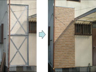 「阪神・淡路大震災では死んだ人の92%が圧迫死など“家に殺された”ものだ」といわれ建物が壊れても潰れない技術が急務とされていたところ、新しい耐震工法『外付け耐震工法パワーウォール(写真下)』を開発。行政から優秀賞の評価を得て施工を始めその工事例は現在までおよそ1,500棟。また耐震診断の出来る耐震プランナー(木造住宅耐震診断士)の資格を日本で初めて創設しこれまでに5,000棟以上の耐震診断を行なってきた。