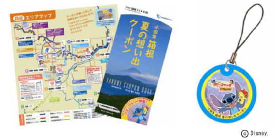 上記期間中、ディズニーDVD発売記念「リロ&スティッチ」スタンプラリーを開催します。箱根湯本駅ほか6カ所に設置したスタンプを添付のシートに4つ以上集めると、リロ&スティッチ「オリジナル携帯クリーナー付きストラップ」をその場でプレゼント。