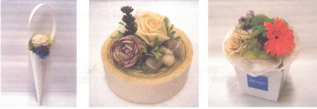 白・シルバー・ブルーを基調とした清涼感とモダンな雰囲気、セロファンを使わない簡易包装、紙製の器を使用しグリーンを多用したアレンジメント、花束・CO2吸収効果の高いといわれる植物、近年人気のプリザーブドフラワーなどが並びます。