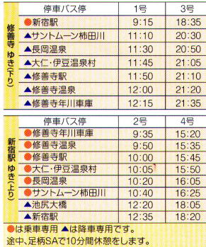 同ライナーは1号車の場合、9時15分に新宿駅西口バス停35番ポールを発車、サントムーン柿田川、長岡温泉、大仁・伊豆温泉村修善寺駅、修善寺温泉に停車、修善寺年川車庫に12時15分に到着、所要時間はちょうど3時間。