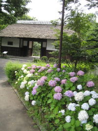 また、同館には府中市内から移築復元された古い建物が8棟点在し、あじさいの花越しに見る大正時代の町役場や江戸時代の茅葺き屋根の農家などが独特の風情を演出します。