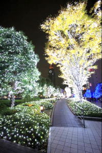 ○新宿サザンテラス『光が持つ純粋な美しさ』/ブルーとホワイトをテーマカラーにテラス全域の植栽にイルミネーションで装飾。