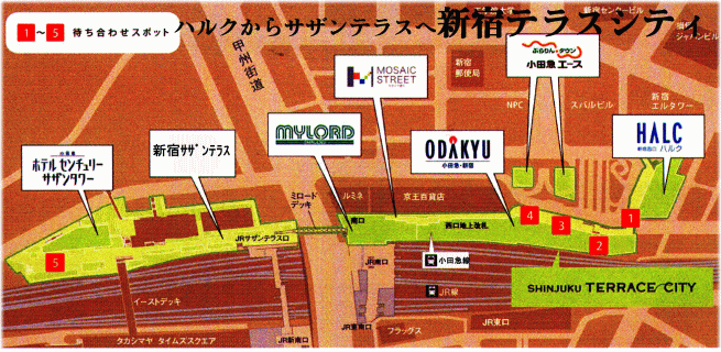 (新宿西口ハルク、小田急エース、小田急百貨店新宿店、モザイク通り、新宿ミロード、新宿サザンテラス、小田急ホテルセンチュリーサザンタワー) |