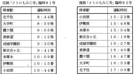 尚、同期間中の10日間、新宿を朝7時から8時までに出発する箱根湯本行きのロマンスカー「はこね号」3本が、通常の停車駅に加え伊勢原駅に臨時停車。また、帰宅に便利な小田原発新宿行きの「さがみ号」2本が伊勢原駅に臨時停車します。 |