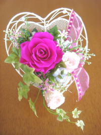 この講座に興味をもたれた方は、一日体験教室をぜひ試してみて下さい。今回のアレンジは、置き型で白いアイアン製のパール付きハート型ベースに、バラ、リボン、小花を使い、蔦の流れる感じが素敵なアレンジです。お花には香りをつけます。体験レッスンの為、リーズナブルになっており、ラッピングもいたします。