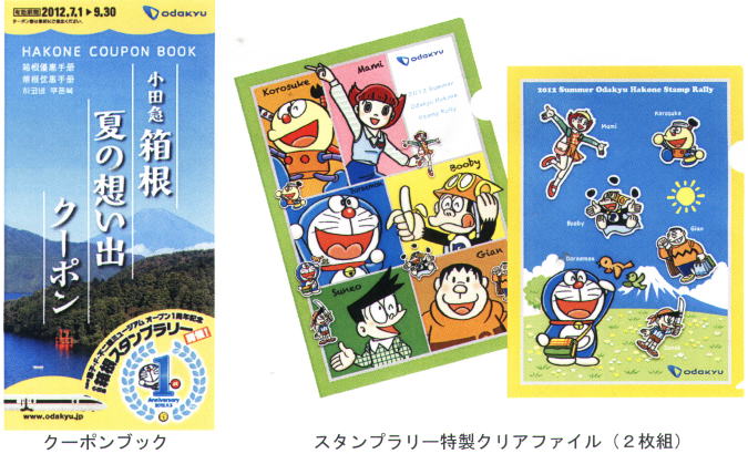 (1)内容=スタンプシートに、箱根エリア内7箇所に設置する藤子・F・不二雄作品のキャラクタースタンプを4つ以上集め、アンケートに答えると、特製クリアファイル(2枚組)をその場でプレゼント。