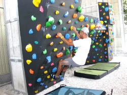 注目すべきプログラムの1つは、人工的なロッククラインミングをイメージしたボルダリングジム(写真右)。下に白い砂利が敷き詰められ、砂浜の上に岩があるという本来のボルダリングのイメージを人工的に再現している。