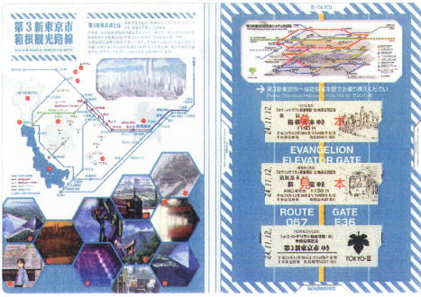 中面:「第3新東京市」の位置などが表記された箱根観光路線図や、物語に登場する箱根の景観などが描かれています。