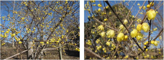 マンゲツロウバイ=ソシンロウバイの変種。花びらが厚く、黄色もより鮮やかなの が特徴。花は丸みを帯びていて、その名のように「満月」を思い起こさせます。