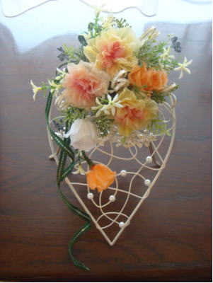 この講座に興味をもたれた方は、一日体験教室をぜひ試してみて下さい。今回のアレンジは、壁掛けで白いアイアン製のパール付きドロップ型ベースに、バラ、グラディエーションカラーのカーネーション、リボン、小花を使い、リボンの流れる感じがお洒落なアレンジです。お花にはバラの香りをつけます。体験レッスンの為、リーズナブルになっており、ラッピングもいたします。
