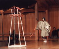 わが子の行くえを捜し求める母の夢に清水観音は三井寺に、と告げた。八月十五夜の三井寺で、僧は稚児を伴い月見をして、寺男が興じて舞っていると、女物狂いがまぎれ込んで来る。わが子千満恋しさに心乱れた母だった。寺男が鐘をつくと、母も仏との縁をつなぐ鐘をつこうとする。憎のとめるのも聞かず、鐘にまつわる故事や功徳を述べたて、掻かれたように鐘を響かせる。稚児が気づき、母子は久々の対面を果たし、連れ立って故郷へと帰って行く。作り物の鐘楼、美しく長い紐を引いて鐘をつく型が見どころ。 |