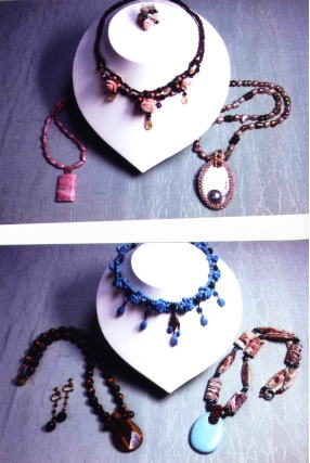 制作する作品はネックレスやチョーカー、ブローチ、ブレスレット、指輪など、すぐに使えるアイテムばかり。 アメジストやトルマリン、メノウ、サンゴ、水晶など、天然石の持つ重厚さや豪華さの中に遊びも取り入れ、季節や流行に合わせた作品を創作しております。 また、皆さまの「こういうジュエリを作りたい!」というリクエストにもお応えしています。