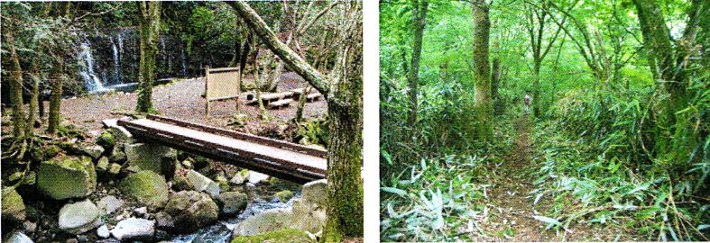 | 寄付金の一部が保全活動に役立てられている「千条の滝」周辺(左)、ハイキングコースの整備 (イメージ) |