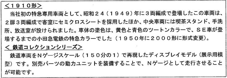 株式会社トミーテックの協力により、1949(昭和24)年に就役して人気を博した、小田急初の『特急専用車」1910形(2000形)を、『小田急電鉄オリジナル鉄道コレクション』として、初めて模型化したものです。