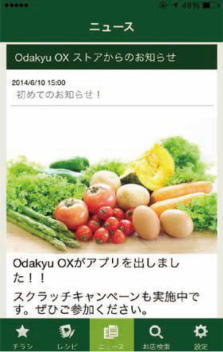 本アプリでは、近くのOdakyu OXから配信されるチラシがいつでもどこでもスマホから閲覧できるほか、料理教室の先生が厳選した「おすすめレシピ」が確認でき、その日夕食にぴったりな献立がすぐ探せます。また、Odakyu OXのイベントやセール情報などがアプリに自動で配信されるため、お得情報をタイムリーに確認できます。