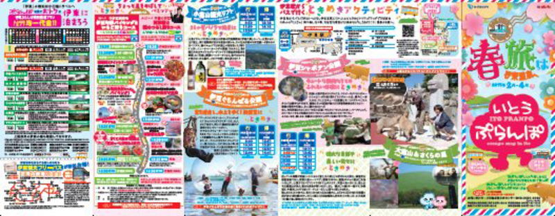 路線バスで行く伊豆高原エリアの伊豆シャボテン公園や伊豆ぐらんぱる公園などの観光施設、定期観光バスを利用した観光モデルコース、伊東駅周辺の散策に便利な街歩きマップ、見頃を迎える椿や また伊東温泉7箇所の宿泊施設の宿泊特別価格、いちご狩りプラン、イベントカレンダーなどが掲載されている。