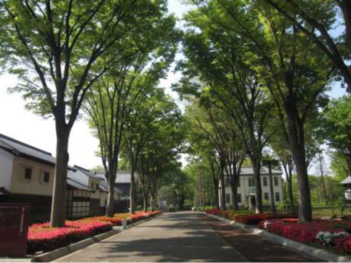 紅白のツツジ、紫のシラン、黄色のムサシノキスゲ…