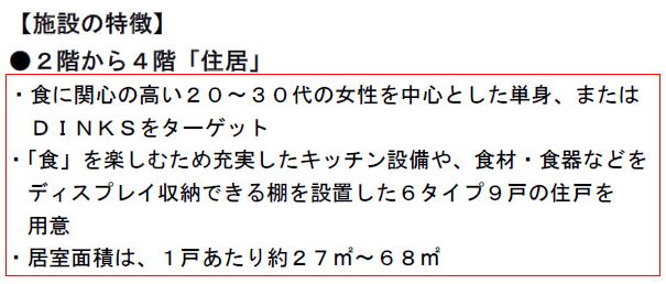 同施設は、2階から4までの居住部は単身世帯やDINKS、SOHOとしても利用可能な賃貸住宅全9戸、店舗部1階はこだわりの食材などを活かしたグリルレストラン席数40席、店舗部地下1階はカフェ&グローサリーショップ席数46席で、「食と住」が一体となったコンパクト複合施設。