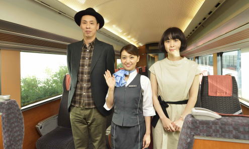 MC:本作は、箱根を舞台に大島優子さんが演じるロマンスカーアテンダント「鉢子」と大倉孝二さんが演じる謎の映画プロデューサー「桜庭」が巡るとってもキュートなプチトリップムービーとなっております。本日は、本作にも登場するロマンスカーMSE内にて、大島さんがアテンダント制服、そして大倉さんは「桜庭」の衣裳にて登場いたします。そして今回は史上初!大島さん演じる「北條鉢子」の車内アナウンスが実現します!