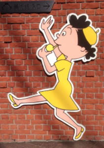 その初日の2015年12月5日、東急田園都市線桜新町駅からサザエさん通りにはあちこちにサザエさんの絵が飾られ、歩いているだけで楽しくなります。 7分後に到着したレンガの建物の壁には、サザエさん一家がお出迎え。観覧者には年配の女性が多く、親子連れの姿も見られました。
