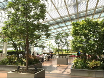 屋上庭園(写真下)は、電車が見えるほど駅のすぐ横にリラックスするのに良さそうな緑あふれる空間です。自由に座れるベンチや椅子とテーブルもあり、日光浴を楽しみながらくつろぐ姿がありました。