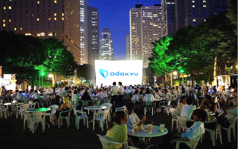 7月20日~9月30日開催の「水と緑のEvening Bar!!!2016」の実施期間中に開催されるもので、新宿高層ビル群の中に位置する同園内に、約縦5m横11mのスクリーンを設置し、公園の緑の中で高層ビルの夜景を背に映画を鑑賞しながら飲食を楽しんでもらおうという趣向です。