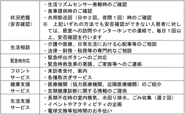 ・「株式会社ニチイ学館」がコンシェルジュ業務を担当し、スタッフが24時間常駐してサポートします。また、介護事業所(居宅支援事業所、訪問介護事業所)を併設し、介護サービスはもちろん「掃除代行サービス」、「高齢者・障害者ケアサービス」、「入退院安心サービス」などを提供します。