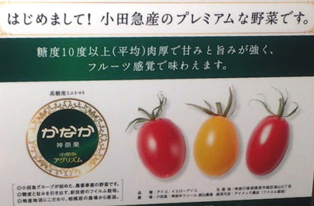 普通のパックのミニトマトが298円、ブランドミニトマトは398円、「かなか」も398円で販売されていた。量が少し少ないのか、袋売りで若干値段の安いものもあった(360円ほど)。今後は店舗での販売のみならず、グループ内のホテルやレストランでも利用する予定のようだ。