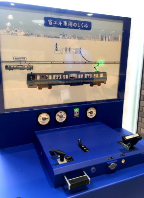 | 申し込みで操作体験できる回生ブレーキ展示(電車の絵が描かれた模型) |