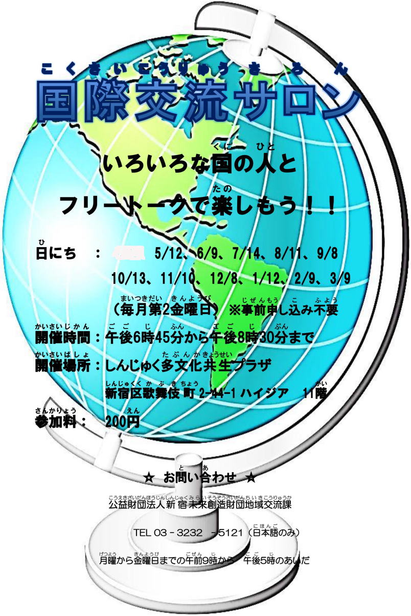公益財団法人新宿未来創造財団「国際交流サロン」は、外国の人と友だちになりたい人、日本語を話したい外国の人が集まって、楽しくお話をする場所です。